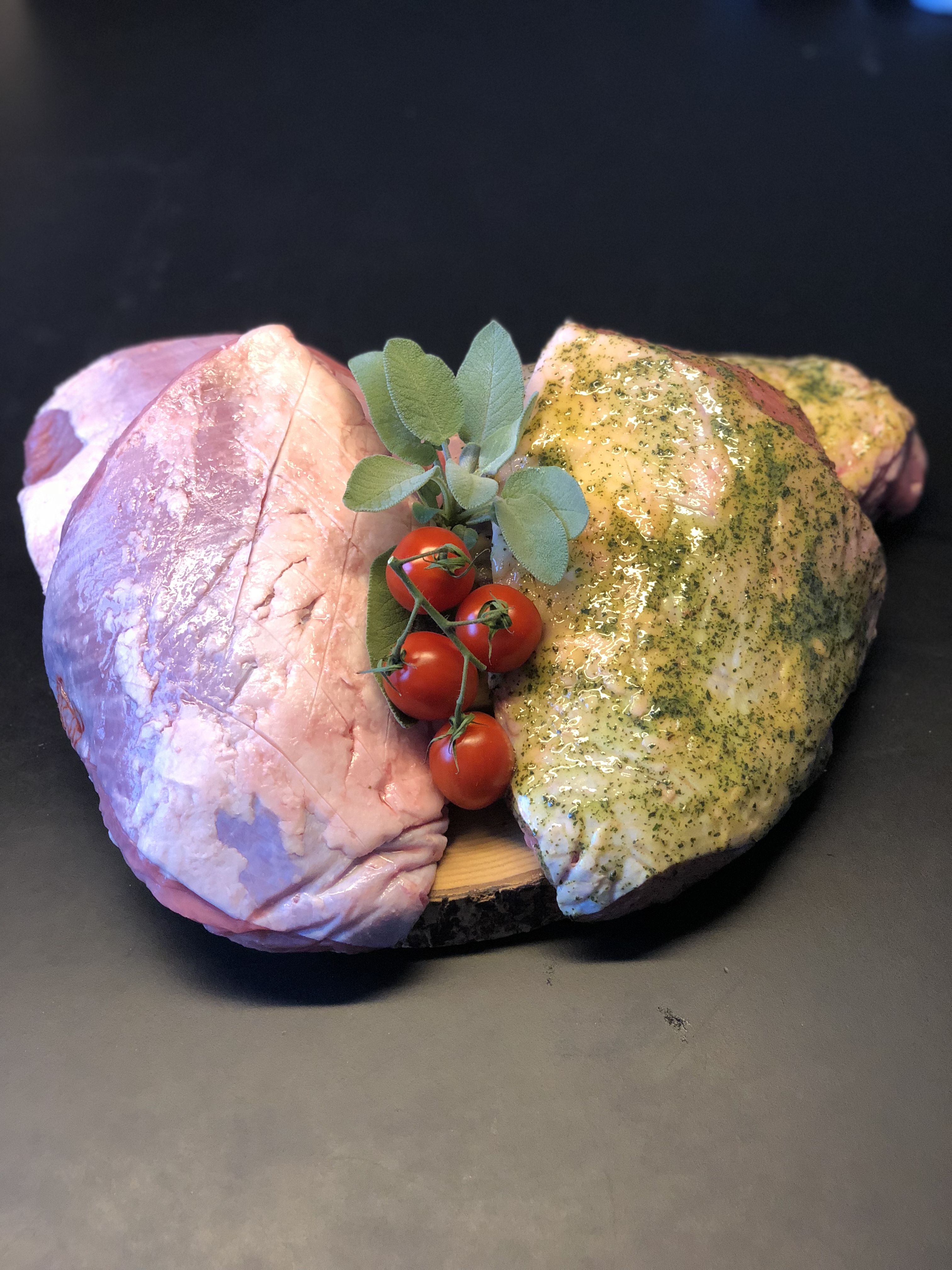 Interval steges, varmluftovn 180c. ind 22 min. ud og hvile i 30 min. under et viskestykke, ind igen 22 min. og nu skal stegen hvile 30 min. under viskestykke før det skæres i tynde skiver, se på bagsiden af kødet, der har vi makerethvilken vej kødet skal skæres.